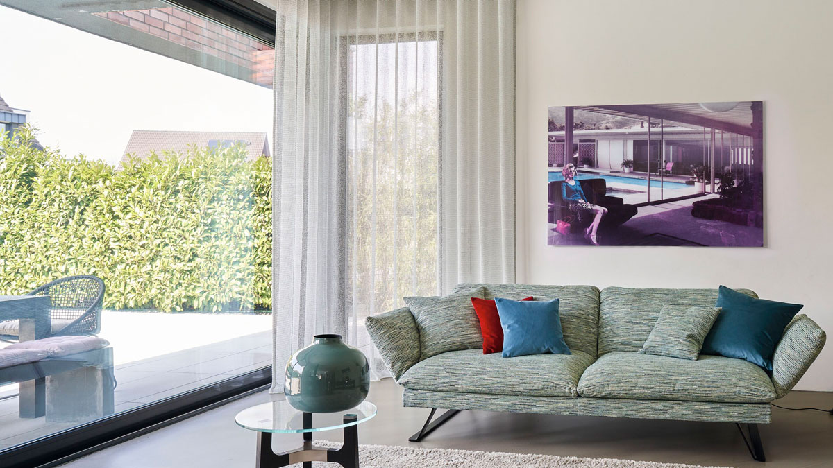 Wohnen in der Gegenwart. Charakteristisch für einen modernen Einrichtungsstil sind klare, puristische Formen, reduzierte Dekorationen und geometrische Muster in Architektur und Wohnraumgestaltung. Wichtig sind minimalistische Formen, durch die sich alles optisch zusammenfügt. Dieser Wohnstil punktet durch eine flexible und zeitlose Einrichtung, die trotzdem Raum für eine persönliche Note lässt. Die Elemente der Möbelgestaltung sind variabel, flexibel und gut miteinander zu kombinieren. Kuschelige Kontraste auf dem Sofa setzen Sie zum Beispiel mit unifarbenen Kissen.